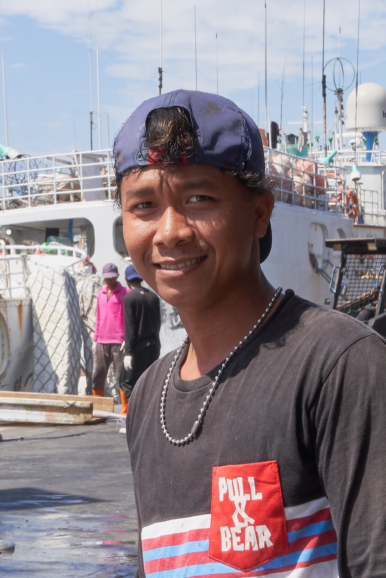 The manual work, cold and hard, is done by Indonesian crews. They are cheerful and proud of their work. They provide for their families with a smile.
