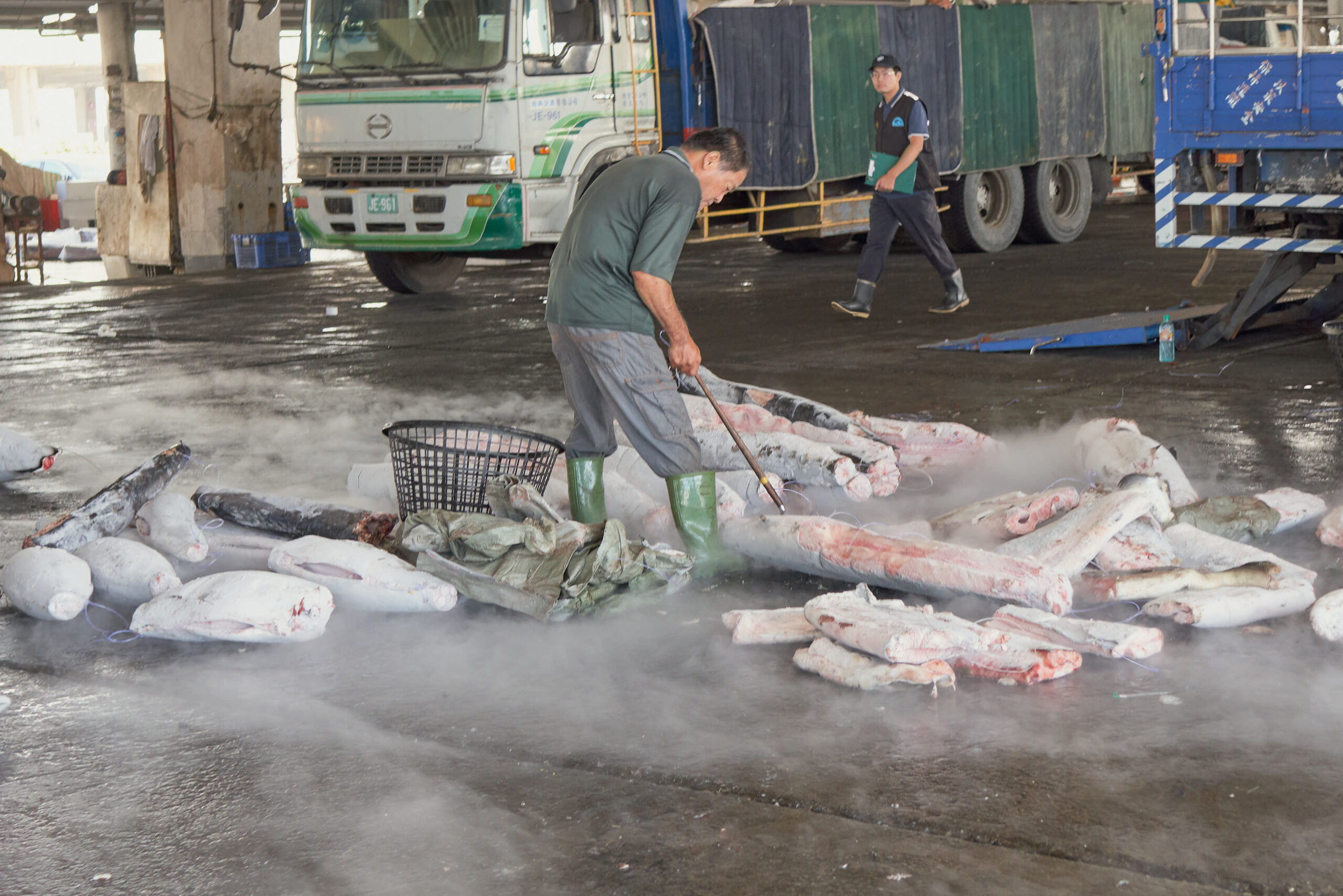 A morning in the busy fishing port DongGang in the south of Taiwan. Hundreds of fishing boats moored at the kay dispose of their frozen cargo: tuna. It is a gruelling sight. Tails and fins have been cut from the fish and they are one by one sent on their way to shore on slides. There they are weighed further and transported with shovels.
