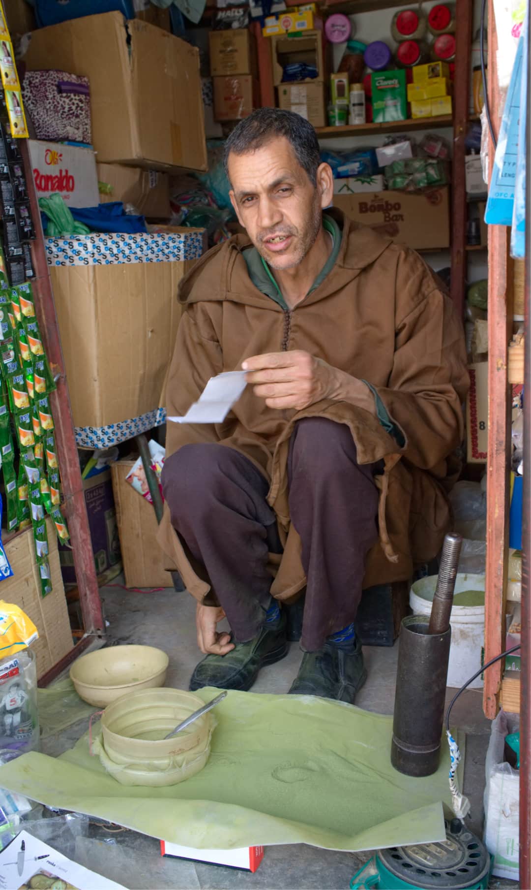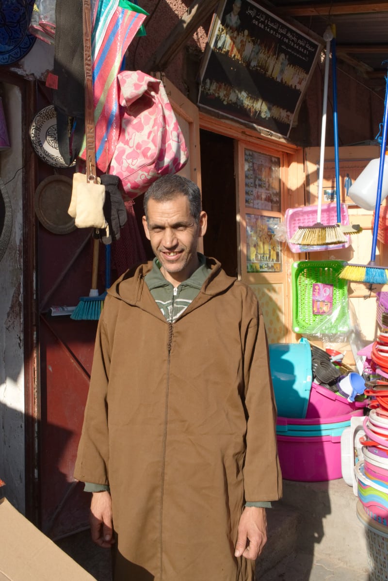 Abder is a good-humored man and sees the bright side of everything. As most Moroccans, the chatting around his little shop has no end and jokes are made continuously. “I sell goods but I also sell chats”. Every 5 minutes someone buys something small like the hennah powder Abder makes himself from the leaves. He is the best as he does not spike it with chemicals. Or a piece of elastic is needed for making clothing is collected by a young girl for her mother. The activity in front of the shop reminds a bit of a continuous cinema albeit with the same movie playing every day.
