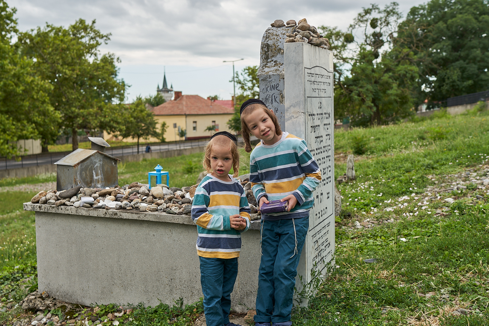 Next to the cemetery, there is a small synagogue a memorial building with self catering restaurant facilities. A professional company keeps all in reasonable, though not very good state. Their name is proudly indicated on the signs on the entrance. The family puts stones on the graves and burns candles. The small grandchildren run around and have fun. The ladies are not happy to be photographed but when Israël tells them it is ok for a family picture they become interested.